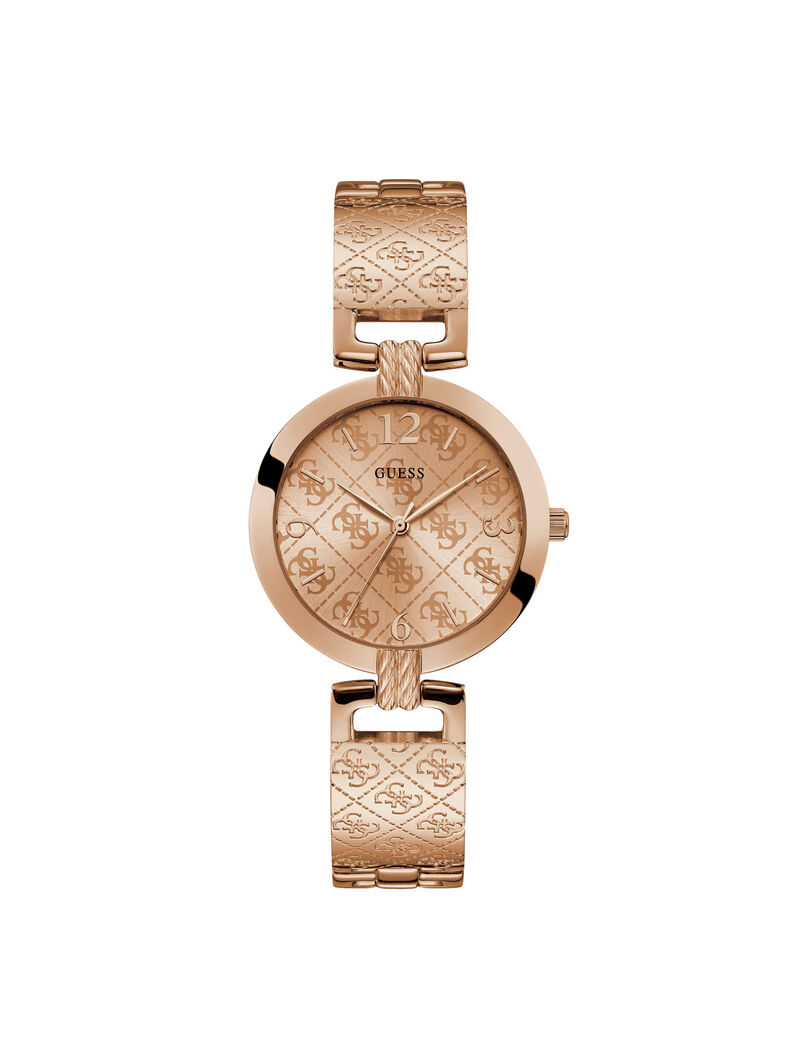 الرقي والفخامة عنوان هذه الساعة، تتوفر باللون الذهبي الوردي، بقرص شعاعي يتزين بشعار العلامة التجارية. وتكتمل أناقتها بسوار يتزين بنقش الشعار.