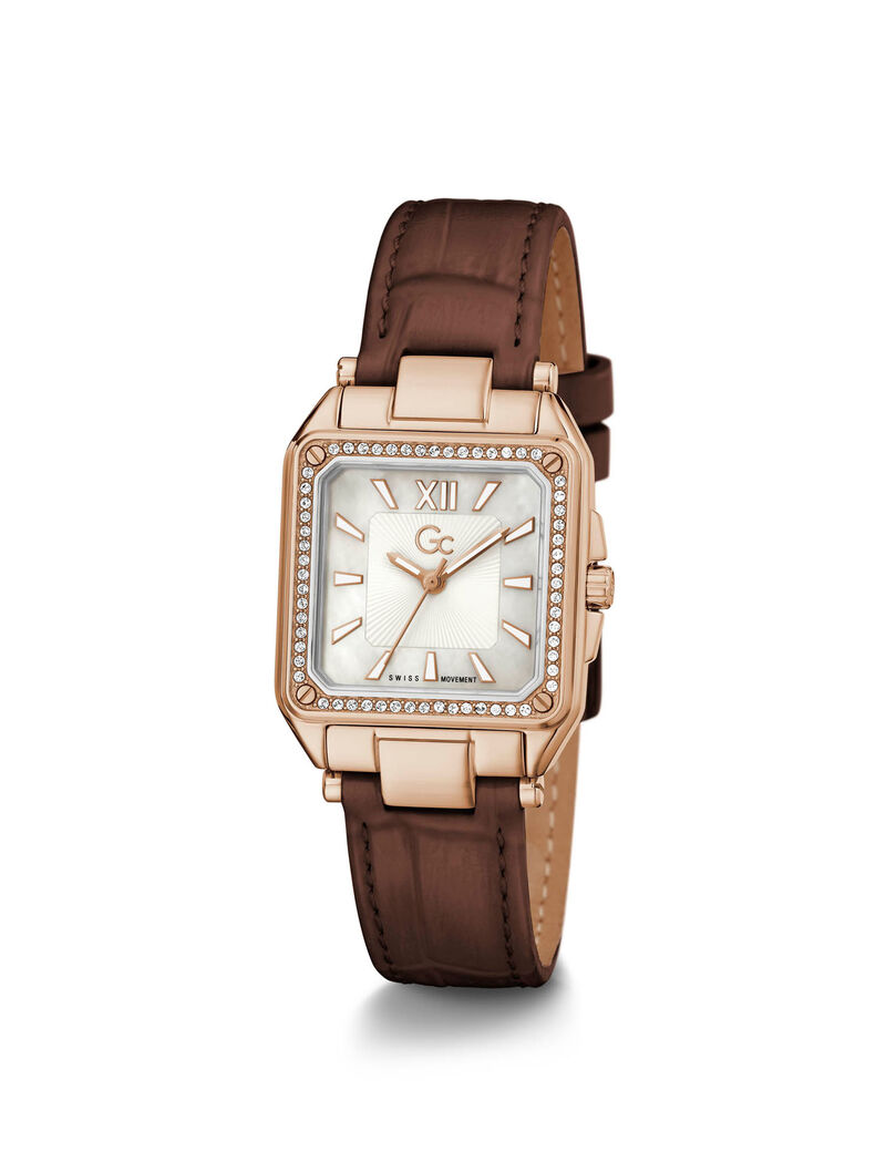 تصميم كلاسيكي لا تنتهي صيحته في ثوب جديد. ساعة يد بتصميم مفعم بالبساطة. تكتسي باللون الذهبي الوردي، وإطار مربع الشكل، وتحتضن قرص مينا يشع بريقاً لا مثيل له مع علامات الوقت المُرَصَّعة بالألماس. تتصل بسوار بني من الجلد الطبيعي يزدان بنقشة جلد التمساح.