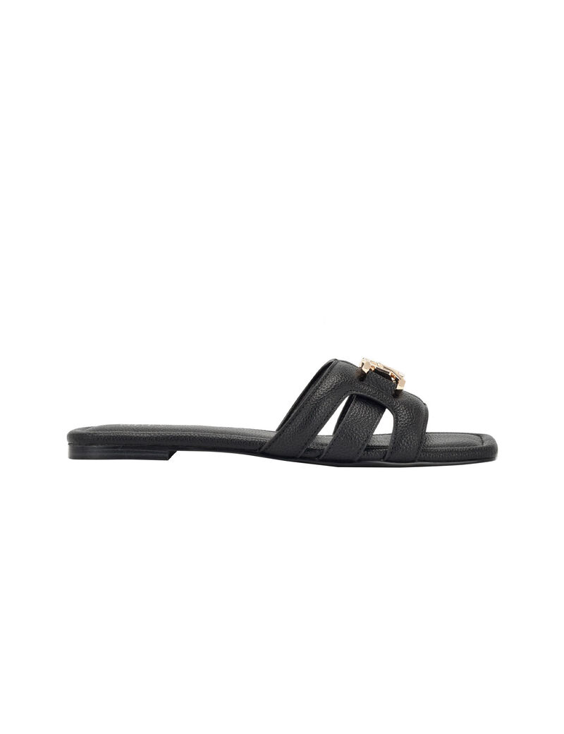 زوج مذهل من الصنادل المسطحة. يتضمن هذا الحذاء المسطح المصنوع من الجلد الصناعي العصري والمريح واجهة شعار الماركة بمقدمة مفتوحة تتناسب تمامًا مع كل الملابس.