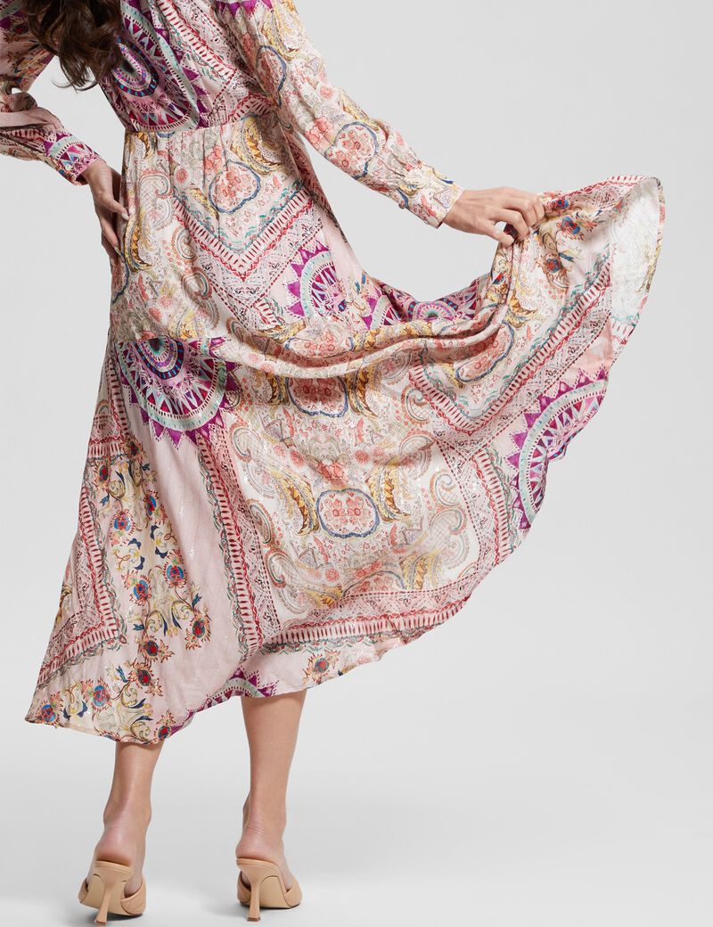 Viscose dress.V neck with ruffles.Long sleeves.Fit and flare style.Zip fastening.FABRIC TYPE: Lurex pinstripe viscose.FABRIC DETAILS: All over print.Picture shows size S.Total length: 130 cm / 51.18 inch.Sleeve length: 63 cm / 24.8 inch.True to size.SHELL (main fabric): 98%viscose 2%metallized.WASH LABEL: Wash max 30°C.