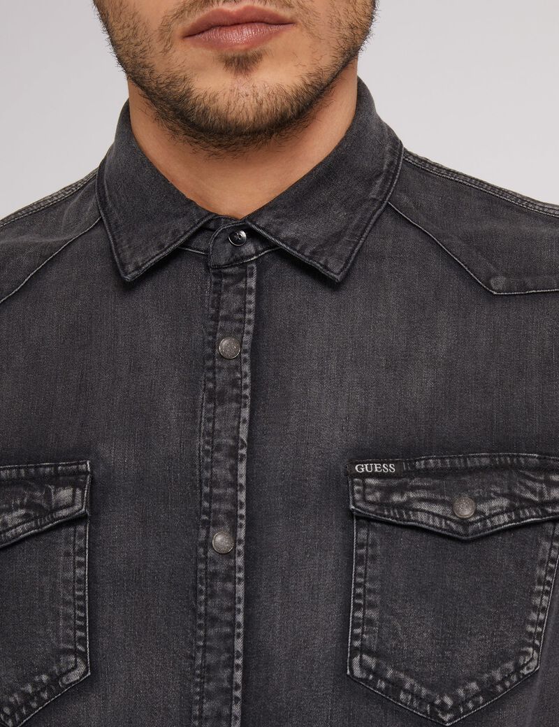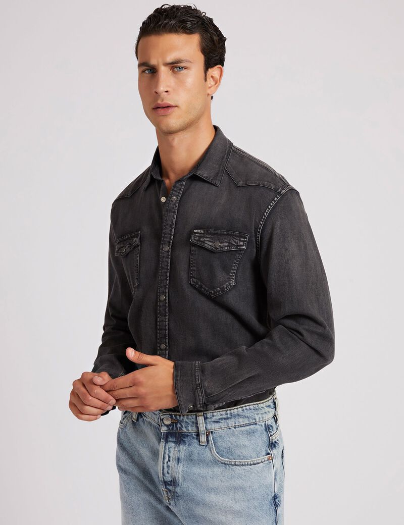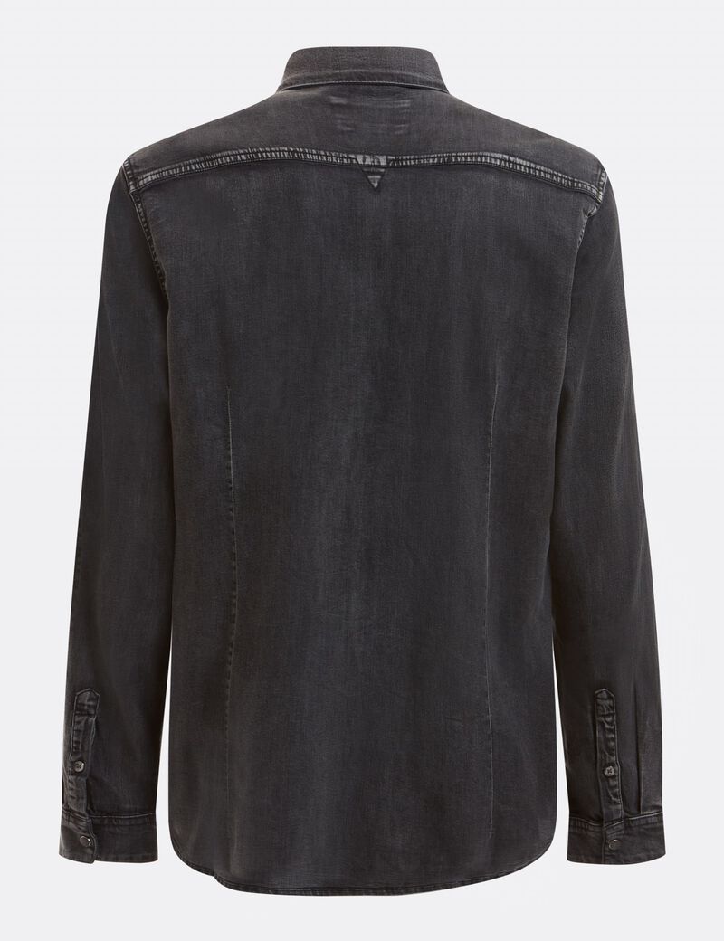 Cotton blend denim shirt. Classic Collar. Long Sleeves. Slim fit. Front button fastening. FABRIC TYPE: Stretch Denim. TREATMENTS: Dark wash. EMBELLISHMENTS: Chest pockets. Picture shows size M. Total length: 78 cm / 30. 71 inch. Sleeve length: 66 cm / 25. 98 inch. True to size. SHELL (main fabric): 98% Cotton 2% Elastane. WASH LABEL: Wash max 30°C.