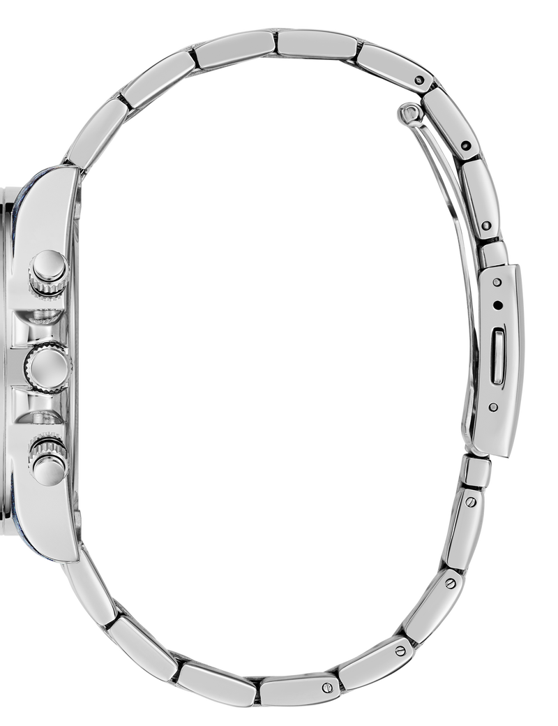 Show your love for GUESS with an iconic denim style featuring a digitally printed denim pattern across the bracelet and multi-function dial with a subtle touch of glitz!